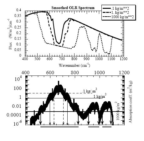It has been suggested that the absorption by CO2 is already saturated so that an increase would have no effect. This, however, is not the case. Carbon dioxide absorbs infrared radiation in the middle of its 15 mm band to the extent that radiation in the middle of this band cannot escape unimpeded: this absorption is saturated. This, however, is not the case for the band’s wings. It is because of these effects of partial saturation that the radiative forcing is not proportional to the increase in the carbon dioxide concentration but shows a logarithmic dependence. Every further doubling adds an additional 4 Wm-2 to the radiative forcing.